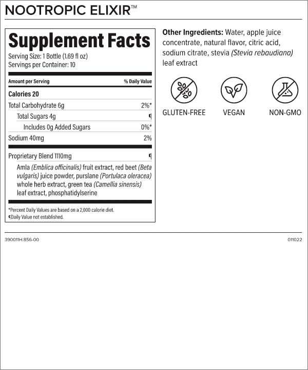Nootropic Elixir helps to boost brain function, memory, and focus through ancient botanical ingredients like purslane, amla, green tea, and beetroot along with other natural ingredients like phosphatidylserine to support long-term brain health.†