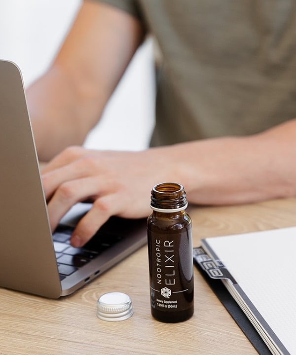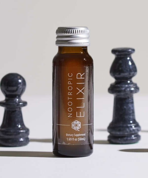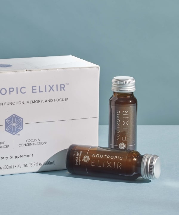 Nootropic Elixir is a sleek, ready-to-drink elixir that supports both on-demand focus for cognitive performance and long-term brain health.†